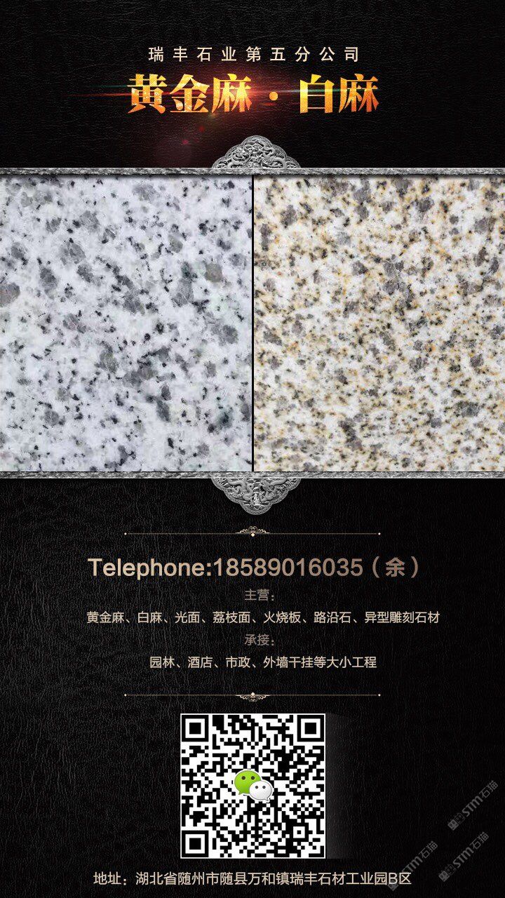 礦廠直銷;黃金麻,白麻,路沿石,蘑菇石,火燒面,光面,荔枝面,機切面,自然面,異形加工等各種規(guī)格板材。承接園林,廣場外墻干掛等各種工程應用板材。規(guī)格齊全,保質保量,歡迎新老客戶來電下單。18589016035