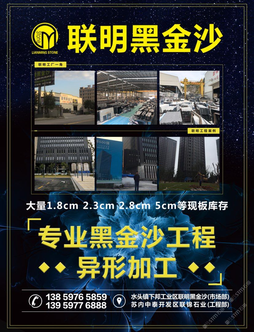 【聯(lián)明?黑金沙】——大工廠的規(guī)模和質(zhì)量,小廠的價(jià)格。兩工廠共占地35左右畝地,一廠為市場(chǎng)部位于水頭鎮(zhèn)下邦工業(yè)區(qū),二廠為工程運(yùn)營(yíng)中心位于石井中泰集控區(qū),是一家集礦山、生產(chǎn)、加工為一體化的綜合性專業(yè)化石材工廠,有著十幾年的黑金沙經(jīng)驗(yàn),公司主要經(jīng)營(yíng)黑金沙市場(chǎng)板,工程板,黑金沙異型加工。工程案例有:1、上海楊浦區(qū)149項(xiàng)目中船大廈,黑金沙總用量3萬平方;2、蒼南天和家園共3期,黑金沙總用量5萬平方;