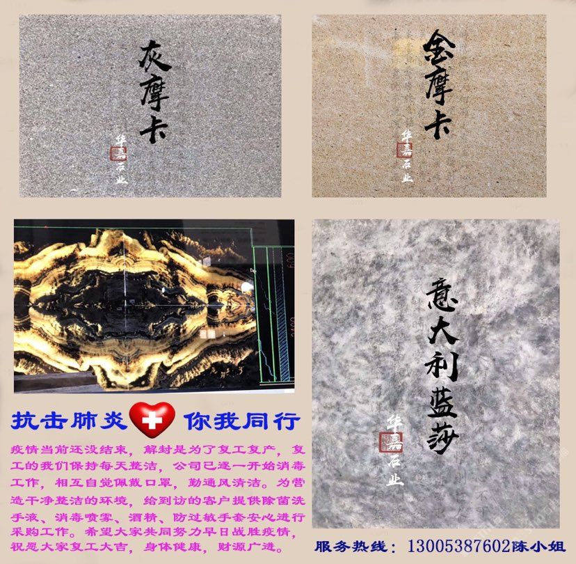公司以代理土耳其/意大利等國(guó)的新型石材為優(yōu)勢(shì),主營(yíng)水墨玉/清水玉、歐典米黃/新莎安娜米黃、古堡灰/云多拉灰、法國(guó)米黃、伊麗莎白、皓月木紋、白玉蘭等大理石荒料及板材;承接各類(lèi)大中型工。建立以六都港作為物流集散中心輻射全國(guó)各大港口、內(nèi)陸/港澳臺(tái)地區(qū)的運(yùn)輸網(wǎng)絡(luò),建成天然石板材生產(chǎn)線(xiàn)三條,擁有自動(dòng)烘爐聚酯補(bǔ)板線(xiàn)一套,全自動(dòng)板材晶光拋磨線(xiàn)一條,年產(chǎn)天然石板材500萬(wàn)平方米,產(chǎn)品遠(yuǎn)銷(xiāo)國(guó)內(nèi)外市場(chǎng)。\