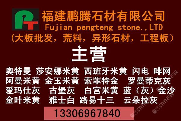 【鵬騰石業(yè)】專業(yè)加工出口超薄板材和超寬大板,并且在國內外各大石材市場設有經銷部和分公司,專業(yè)批發(fā)各種 大理石大板、花崗巖大板,并承接國內外石材工程。