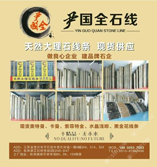 尹國全石線 聯(lián)系人:國全石線(杭州)    150****8386 查看 手機號碼:無 主營范圍: 異型加工、大理石加工、石材雕刻、其他、 企業(yè)地址:浙江杭州杭州石材市場三區(qū)D46