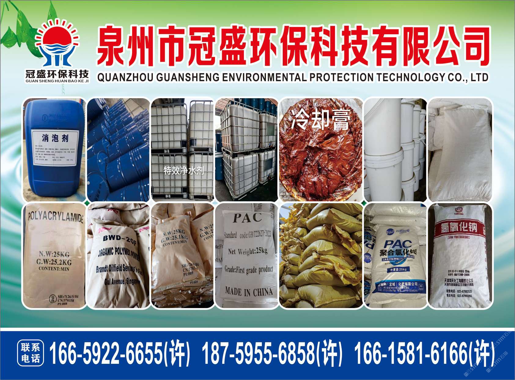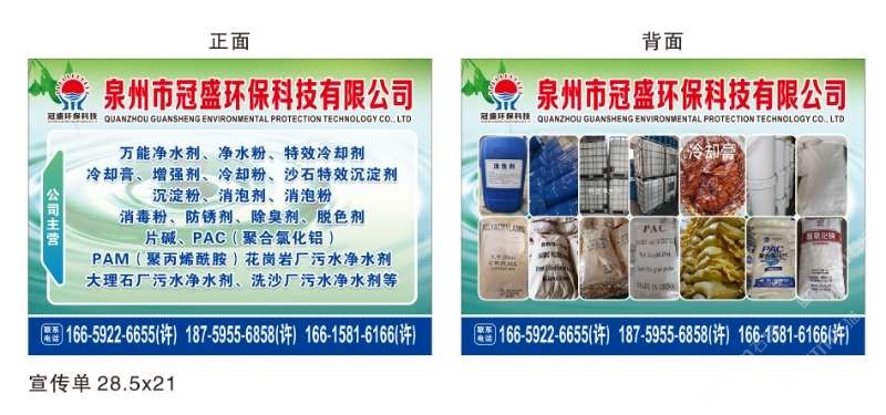 發(fā)布信息: 冠盛環(huán)保科技16615816166 主營產(chǎn)品:凈水劑,冷卻劑,冷卻粉,大理石人造石專用凈水劑,沉淀粉,消泡劑,消毒凈水劑,防銹凈水劑,除銹劑,除臭劑,聚丙烯酰胺,聚合氯化鋁,鹵精,洗沙專用凈水劑,壓濾機專用凈水劑,陶瓷廠專用凈水劑(黃藥 白藥)等所有水處理環(huán)保材料……